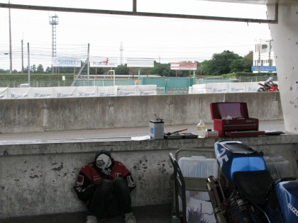 12:01 ピットに戻ると 浦川くん、睡眠中。 若い時は、こんな体勢でも寝られるけど、歳を取ると、この体勢では、絶対無理! NS1クラスの決勝は13:05~。 その前のスタート進行は12:40~始まります。 |