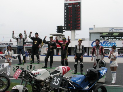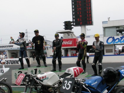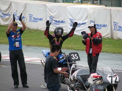 13:26 で、記念撮影 入江選手、4位入賞おめでとう! 次回は、来年になるけれど、10秒切り、中排気量のトップ目指して頑張ろう! |