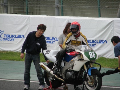 12:56 こちらはポール こちらはポールの#96、舟木選手。 國川くんがお手伝い。 マシンはイタリアヤマハのSZR660。 660cc、流石に速い。 |
