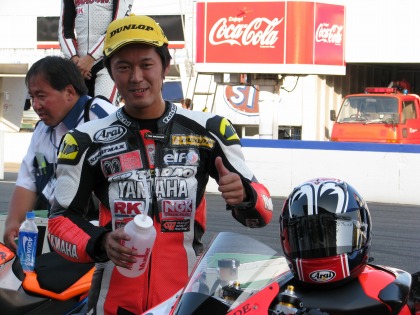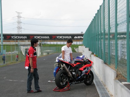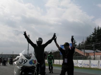 11:23 マシンと一緒に 表彰台に上がる前、まずはマシンと一緒に記念撮影! 2004年型CBR、ハルナ海坊主選手と1シーズン頑張りました。 |