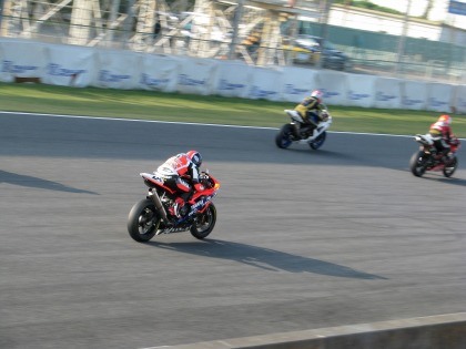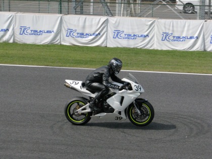 11:03 スタートは クラッチミートがやや遅れ気味(?)、その後は、写真のとおりフロントがわずかに浮く程度の上手い加速をしていきました。 願わくば、タンクにヘルメットを付けるくらい伏せた方が、カッコいい! |