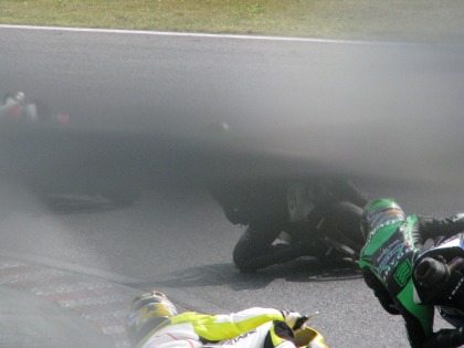 10:57 スタート5分前 スタート5分前です。 1列目グリッド2番目は、もちろん前には誰もいない。 (レースクィーンがいますが。なんて、突っ込みはしないように!) もちろん、昨日に引き続き、スタート5分前のボードの写真が撮りたい訳ではない。 レースクィーンが撮りたいんですけど、まばたきしちゃってました。 どうやら、自分はまばたきのタイミングでシャッターを押すのが上手いらしい。 |