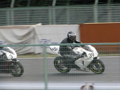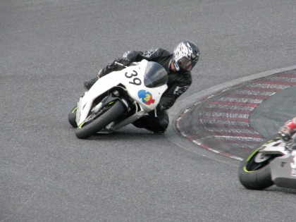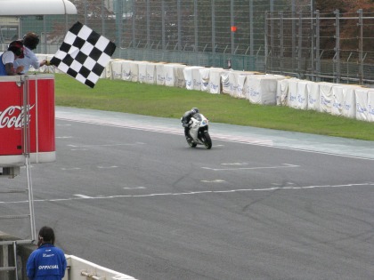 11:19 レース終了 最終コーナーを立ち上がって、ハルナ海坊主選手、今チェッカーを受けます。 最終的に、前を行く#3の選手が14周回、最終コーナーで転倒、一つ繰り上がって、6位でチェッカーです。 決勝中のタイムは、1分2秒715と予選のタイムを上回ることはできませんでしたが、それでも、3秒切りのご卒業タイムでした。 ※ 正式な結果は、下記の筑波サーキットのHPで! http://www.jasc.or.jp/result/2009/2/091003-04_r.html#race7 |