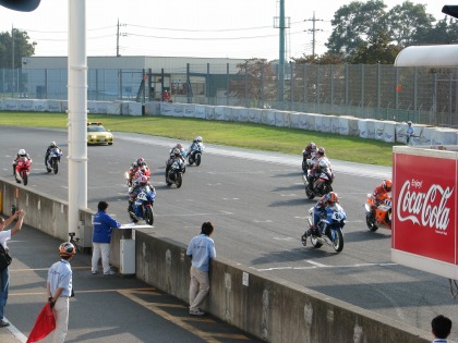 10:56 サイティングラップ 前のクラスの予選が終了し、今日一発目の決勝となる、TC600の決勝が開始されます。 パドックから、コースインし、サイティングラップを終え、グリッドに着きます。 |