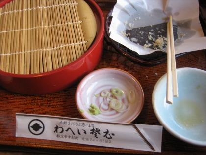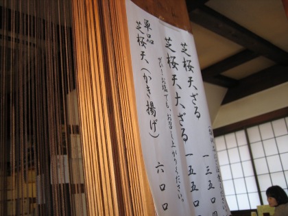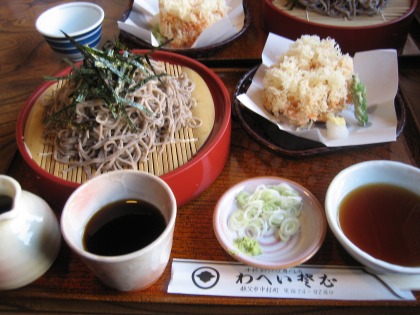 12:34 注文は 注文は、3人ともお薦めの芝桜天大ざる。(¥1,550) くるみ汁にするか迷いましたが、まずは正道のしょうゆ、普通のつけ汁で注文。 何度かきているプーさんは、お気に入りの”くるみ汁”を注文。 |
