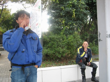 9:15 アイスエイジさん、到着 少し遅れて、アイスエイジさんが到着。 自分が出発する前、電話がかかってきて、 『今、原宿なんだけど・・・・』 (原宿と言っても、東京の原宿ではない。横浜の国道1号線の原宿交差点だ!) また、ずいぶんと違う方向に行っちゃいましたね。 と、言うことで、Uターンしてきてのご到着。 |