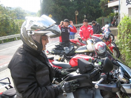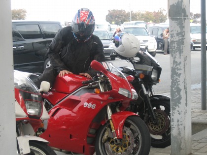 9:42 岩井さん到着 少し遅れて(?)、岩井さん到着。 9時過ぎには、海老名SAに到着していて、別の場所で待っていました。待ちぼうけをくらっていました。 海老名SAは広い。 だれが決めたか知らないが、自分たちの場合、待ち合わせ場所は、たいがいサービスエリアの前の方だ。 岩井さんのマシンはDUCATIの996。 |