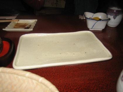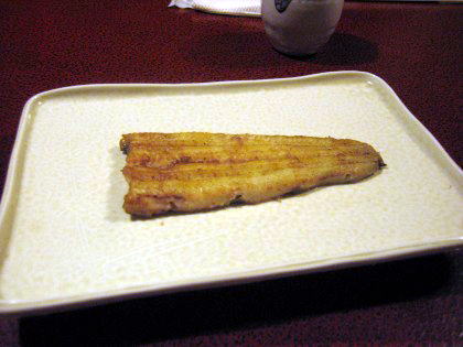 14:34 白焼き 15分ほど待って、”白焼き”が運ばれてきました。 どうしても、下世話な話になって申し訳ないのですが、半分で¥1,890也。(お高い!) さっそく、Zephyrハルナ海坊主さんと半分ずつにして、『いただきます!』 半身だと、一口で食べられそうですが、その度胸はありません。(度胸の問題ではないと思うのだが・・・) 醤油とワサビをつけて。 味は完全に白身の魚ですね。 穴子なんかより、よっぽどクセがない淡泊な味です。 ただし、すっごく脂がのっています。 イメージ的にもっと香ばしく焼けているかと思いましたが、そんなことはありませんでした。 味が非常に淡泊なので、自分には、ご飯のおかずとしては不向き。 お酒のつまみがベストかな。(今日は呑み合わせていないので、よくわかりませんが) |