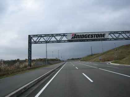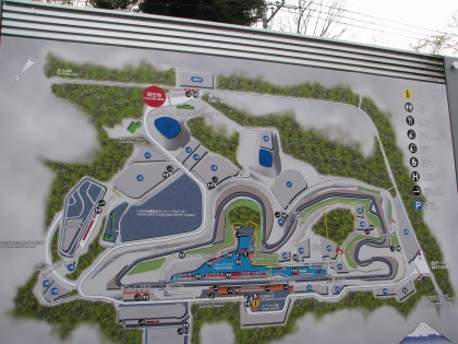 12:38 富士スピードウェイに 三国峠、明神峠を越えて、小山町まで下りてくると、空は少し明るさを取り戻していました。 予定通り、富士スピードウェイに寄ってみることします。 「メインコースへの行き方は」と、東ゲートにある看板で探します。 |