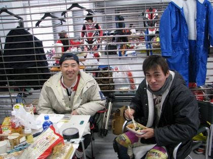 12:57 見つけた! ピットの番号だけ調べてきたので、IKEZOくんのいるNo16ピットへ。 IKEZOくんと同じチームのサトウさんがいました。(写真左) 『こんにちは! IKEZOくんは?』 只今、一生懸命走行中でした。 右の人は、もう一人のライダーさかさん?。 『初めまして!』 |
