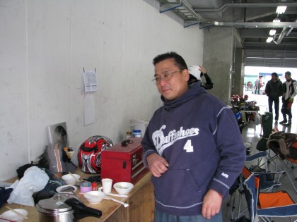 13:06 あれっ? 16番ピットの中をウロウロしていると、どこかで見た顔が! 全然ここにいると思わない人が、突然目の前に現れると、一瞬誰だか分からなくなっちゃうことありません? いやいや失礼! エビスサーキットの走行会を主宰してくれている、モトガレージムラコシの村越さんでした。 全然、知らなくて、しかもIKEZOくんと同じピットとは! 今日のレース自体、100チーム以上エントリーしているのに、何たる偶然。(エントリーしていること自体知りませんでした) 追) 『豚汁ご馳走様でした!』 美味しゅうございました。 |