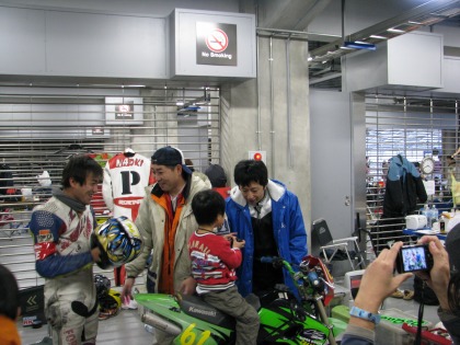 14:10 ピットイン IKEZOくんのチームのバイクが戻ってきました。 マシンは、カワサキのKSR80。 キャブのジェットを交換したぐらいで完全ノーマル。 このレース、2サイクルは85ccまで、4サイクル125ccまでです。 |