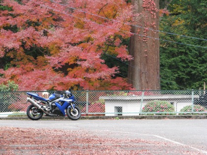11:27 燃えるような 大雄山最乗寺を後にして、ふたたび広域農道に戻り、終点まで進み、県道78号御殿場大井線に入り、西進し、万葉うどんがある地蔵堂付近まできました。 道ばたに燃えるように紅葉した木があったので、停まって写真を一枚。 今年の、紅葉もこれが見納めになるかな。 |