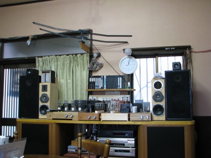 12:02 店内は 以前にも紹介したことがありますが、店内は4人がけのテーブルが2つ。座席8人の小さなそば屋さんです。 店内にはご覧のとおり、真空管アンプ中心にオーディオが鎮座しています。 前にきたときよりも、オーディオの幅が広くなったような・・・(^^;) 入り口の引き戸が半分使えなくなっていました。(笑) |