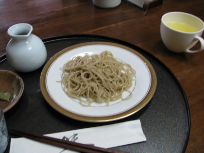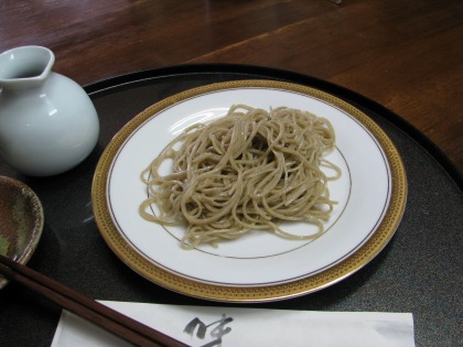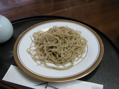 12:07 一皿目は せいろではなく、皿で供されるのが、すぎやま流。 一皿目は、更級。 そばの実の中心部分、日本酒で言えば大吟醸、の粉で打った蕎麦です。 そばの実の中心部分は、外周部分と比べると、味は薄く、歯ごたえ喉越しを楽しむ蕎麦です。 すぎやまの蕎麦は、かなりの細打ちです。 そして蕎麦汁は意外にも薄め。 香りが立つ汁で、少々付けすぎても、蕎麦の味が消されることはありません。 |