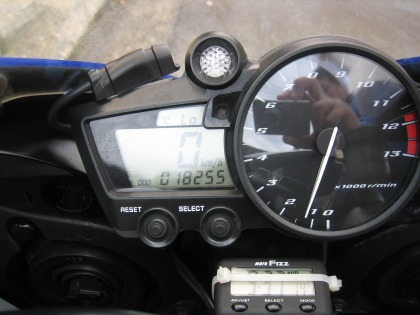 11:31 走行写真 最近、ツーリングのブログを見ていると、走っているとこの写真をよく見るようになりました。 みんな、自分の真似をしているのかな?(そんなことはない!)と思ったら、バイクにデジカメを固定するアダプターが市販されているんですね。 自分は、以前からアクロバティックに、走りながら手持ちで撮っています。 なので、ちょっと無理をして、手を上げて写してみました。 「こんなアングルで写真は撮れまい」と自慢しても、自慢にもならない。 |