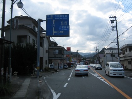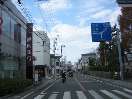 12:15 土肥の市街地 国道136号線を西走し、土肥の市街地までやってきました。 標識にあるこの先の交差点を右折して、松崎を目指します。 今日の昼食の目的地は松崎です。 |