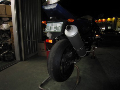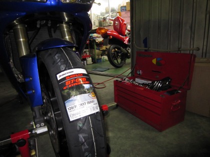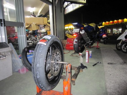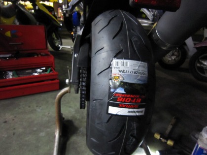 19:41 装着完了 リヤタイヤ、装着完了。 時間を見ると、結構かかってますが、リヤタイヤを交換するついでに、リヤのスイングアーム回りの掃除もしてるもんでね。 |
