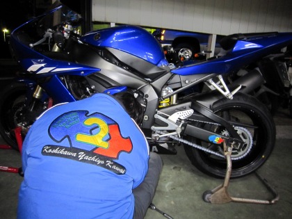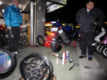 19:55 次はフロント リヤの次は、フロントタイヤ。 只今、誠心誠意、フロントタイヤを取り外し中。 サーキット専用のCBRのタイヤ交換は以前から自分でやっていましたが、最近はR1のタイヤ交換も自分でします。 おかげで、リヤのホイルは傷が増えました。(汗) 危なっかしく交換しているのを見て、メカニックの藤巻さんが助けてくれます。 タイヤ交換の途中で仕事仲間から、携帯で呑みのお誘い。 『タイヤ交換しているので』と断ると。 『自分でするの?』と。 ちゃんと、自分で交換してます。の証明写真。 |