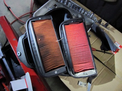 21:52 最後は 最後はエアーフィルター交換。 社外品の、ステアリングダンパーを外して。 (これが結構面倒臭い) ガソリンタンク外すと、エアークリーナーボックスが現れます。 19,000km走った割には、汚れてませんね。 |