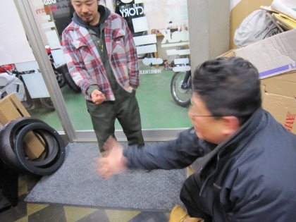 19:58 取り外し完了 フロントタイヤの取り外しが終わりました。 ちなみに、タイヤチェンジャーじゃなく、手作業。 まあ、基本ですね。(笑) タイヤ交換をしていたら、いつもの様に男レーシングさん登場。 自分が写っている写真は、男レーシングさんに写してもらいました。 (あーりがとねぇ〜) |