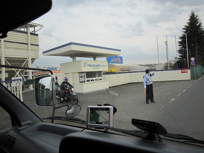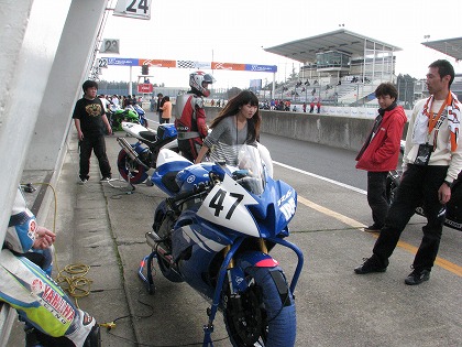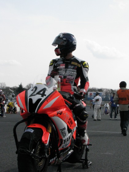 14:00 コースインゲート前で 決勝前のマシンチェックを受けたら、コースインゲート前にマシンを並べます。 ここで、タイヤウォーマーにかけておいた熱々のタイヤに交換。 今日は暖かいですが、この季節、マシンを移動する度にタイヤウォーマーを外していると、タイヤが冷えてしまい、持っているパフォーマンスを生かし切れません。 それなので、仕方なく、コースインゲート前までは転がしタイヤ(予備のタイヤ)を付けておいて、直前に暖めておいたタイヤに交換する作戦です。 |