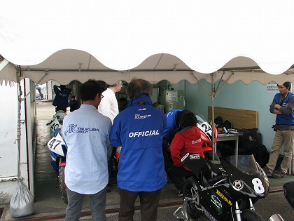 13:51 マシンチェック 決勝前、コースインゲートに並ぶ前にマシンチェックを受けます。 決勝はすでにグリッドが決まっているので、急ぐ必要はありませんが、コースインゲート前に並んでから、タイヤを交換するので、あまりのんびりすることもできません。 |