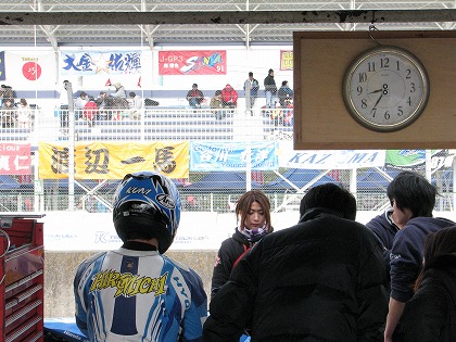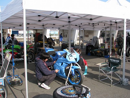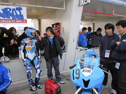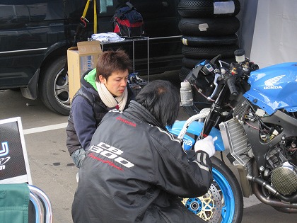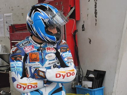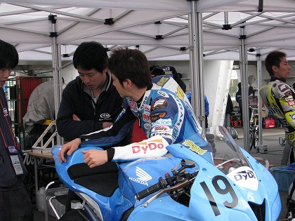 8:12 パドックでも パドックにライディングの準備を終えた國川選手がやってきました。 ここでも、國川選手はスタッフとディスカッション。 自分が納得する答えを出すためか、國川選手は周りの人たちと良く話をしています。 写真の右端に、ちょこっと写っているのは、以前世界グランプリの250ccクラスに参戦していた関口太郎選手ですね。 |