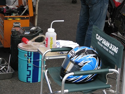 8:07 あるじを待つ パドックであるじである國川選手を待つヘルメット。 國川選手はアライヘルメットのサポートを受けているライダーです。 |