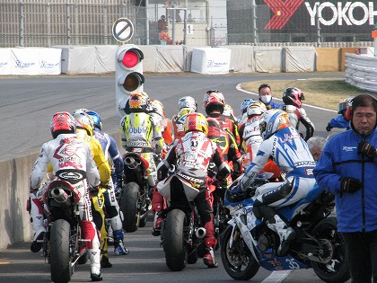 8:21 ウォーミングアップ直前 ウォーミングアップラン開始の時刻になりました。 ピットロード出口で信号がブルーに変わるのを待ちます。 各ライダー、決勝へ向け最後の調整・確認に入ります。 今朝は、朝まだ早いこともあり、昨日の予選と異なり、少し気温が低めです。 |