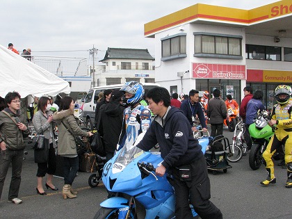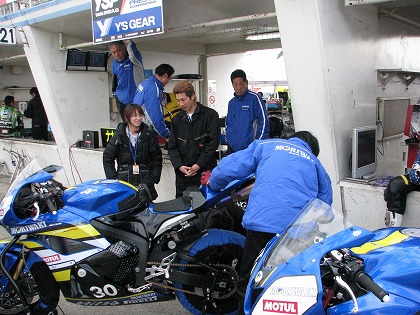 8:31 興味津々? 國川選手の隣には、去年JSBを走っていた山口辰也選手のモリワキ(ホンダ)のマシン。 でも、ピットはYSP(ヤマハ)。 ピットの中には、往年の名ライダー、シャケさんこと河崎裕之さんが・・・・。 『こんなところに、ホンダのバイクを置くんじゃねぇ!』 とは、言わない。(^_^;) みんな他のメーカのバイクに興味津々。のぞき込んでいる。 |
