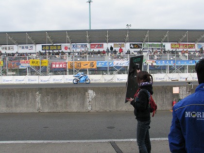 8:53 ウォーミングアップラン終了 ウォーミングアップランが終了し、パドックに戻ってきました。 ウォーミングアップでは、國川選手6番手タイム。好調です。 ウォーミングアップ、2位に付けたハルクプロの中上選手が、ブリヂストンユーザー、 5位のSP忠夫レーシングチームの大崎選手がダンロップ、その他10位までの選手の内、8人がピレリユーザーと言う、ピレリタイヤの好調さがうかがえます。 コースが狭い筑波サーキットは、パドック=インフィールド。 レース中でも、ピット裏に普通の観客が入ってこられるのは、全日本が開かれているサーキットでも筑波サーキットだけでしょう。 それだけに見に来るお客さんには楽しみ。 でも、ピットクルーは、観客の方とぶつからないか、気を使います。 |