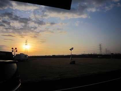 5:56 サーキットの朝は バンクで明ける。 昨晩遅く筑波サーキット隣のオーバルコースに戻ってきて、ハイエース泊。 ふと気付けば、車中泊をしている人は少ない。全日本だからね。 筑波戦のときは結構多くの人が車中泊をしていますが、流石に全日本はプロ、セミプロの集団ですから。 少なくとも、伊藤真一選手なんかが、ハイエースの中で寝泊まりしていたら、夢が無くなると言うものです。(笑) |