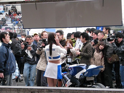 13:17 ピットウォーク ST600の決勝が終わり、とりあえずの片付けも一段落したので、『JSB見てきまぁ~す!』と言って、ピットに戻ってきました。 JSBのレースまでの間、昼休みの時間を利用して、ピットウォークを開催しています。 ケイヒンのピットの前には、伊藤選手のマシン。 その傍らには、レースクィーンのお姉さん。 その周りには、昔のカメラ小僧(笑)が群がっています。 レースクィーンのお姉さんを見に来るのも、全日本の楽しみのひとつですね。 |