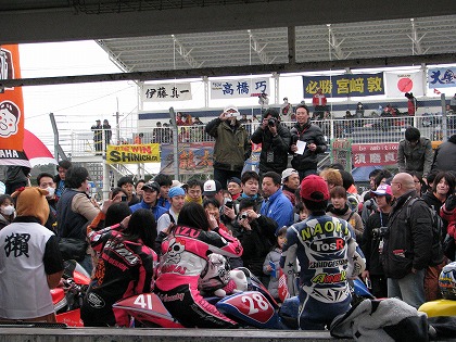 13:17 ここのピットは凄い人だかり。 女の子ライダーはもてますね。 と、言っても、国際A級ライダー。 |
