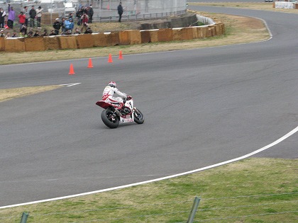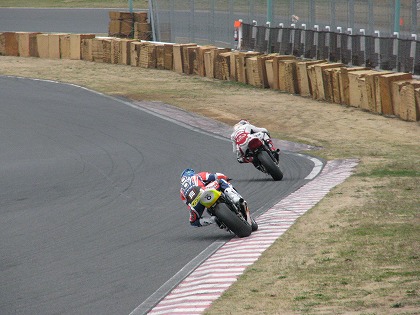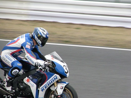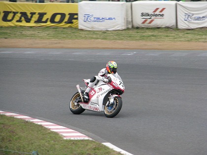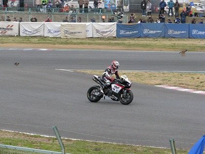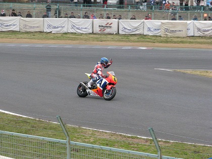 14:38 終了 30周回で争われたJSBが終了しました。 優勝は、高橋選手。 2番手からスタートして、一度もトップを譲ることなく、チェッカーを受けました。 高橋巧選手は、JSB挑戦2年目にして初優勝。 『おめでとう!』 高橋選手は、まだまだ若いく、将来・・・否、今シーズンチャンピオン候補のライダーの一人です。 |
