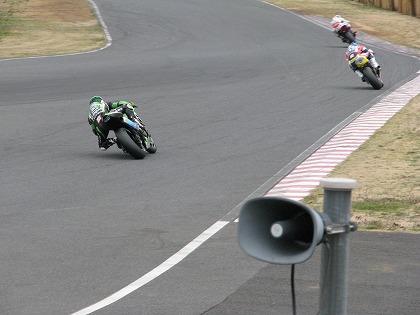 14:11 開けっぷり 2周目を終えてMCコーナーを立ち上がる、トップグループ。 逃げる、高橋選手。 追う、2番手亀谷選手、3番手柳川選手。 柳川選手はアクセルをワイドオープン。 たまらず、マシンはリヤタイヤをスライドさる。 MCコーナーのスタンドから見ていても、カウンターをあてているのがわかります。(凄っ!) これぞ、モンスターパワーのJSBの醍醐味。 |