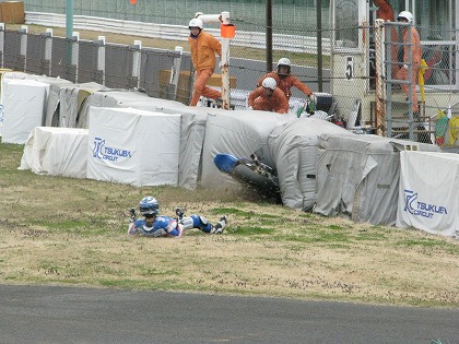 14:11 やっちゃった! 2周回目、7,8番手を走っていた、伊藤選手。 MCコーナー2つめの左コーナーで、ステップを縁石に引っかけるような形で転倒。 転倒したマシンは、エスケープゾーンの狭いMCコーナーをスポンジバリアーまで飛ばされていきます。 スライドする伊藤選手は、グリーン上で停止。 |