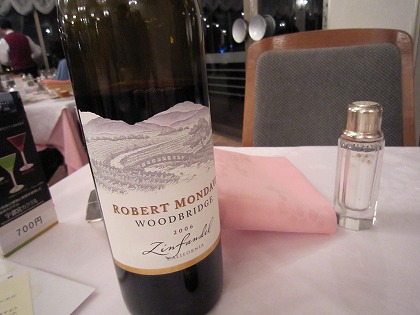 19:25 ワインを注文 何を飲もうか思案していると、今日は嫁さんが飲むというので、赤ワインをフルボトルで頼むことにしました。 メニューにある赤ワインは5〜6種類、値段はフルボトルで4千円〜6,7千円まで。 自分は比較的廉価な、カリフォルニアのワインを注文。 テーブルワインとして、クセがなく料理の邪魔をしない飲みやすさで、正解! |