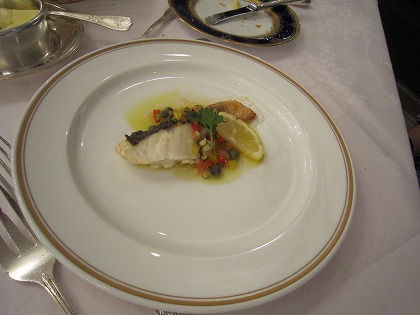 19:37 魚料理は 鱸(すずき)のポワレ ヴィネグレットソース。 すずきをフライパンで焼いたものに、ヴィネグレット→ヴィネガーなので、ワインヴィネガーなどで作ったソースをかけたものですね。 あっさりした味のすずきと、さっぱりしたソースの組み合わせは、軽やかな味で、これも上品。 カリッとした皮が美味しいですね。 |