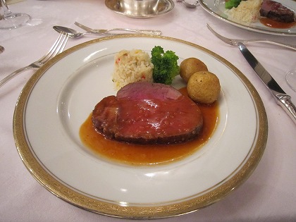 19:53 肉料理は メインは肉料理。 牛フィレ肉のロースト、でソースは王道のグレイビーソース。 ローストビーフはほとんどレアー気味に仕上げてあり、とっても柔らか。グレービーソースは軽めで、脂分の少ないフィレ肉の味の邪魔していません。 久し振りに食べた、ローストビーフは美味しいですね。 !(^o^)! 付け合わせの、炒飯(ピラフではない)の味付けが、アジアンテイストで、面白い組み合わせだった。 |