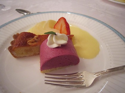 20:22 デザートは デザートはカシスのムースと胡桃タルト。 カシスの味は個性が強いですね。胡桃のタルトの味が消えてしまうので、タルトを先に食べた方が正解。 一品一品の量は少なめでしたので、最初は足らないかなと思いましたが、ここまで食べると結構お腹一杯になりました。 |