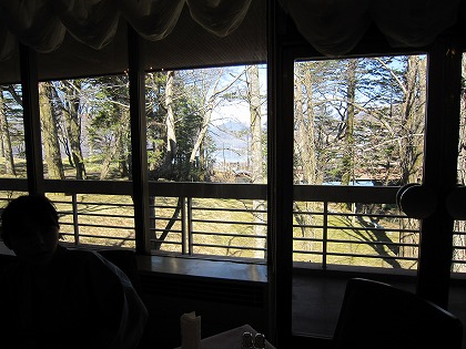 8:18 朝食は 朝食は昨晩と同じレストランで。 中庭に植えられた木々の隙間から、中禅寺湖を望むことができます。 |