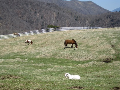 12:09 大笹牧場には ミニチュアホースがいます。 馬同士、お互いに食べ合ってます。 ではなく、お互いに背中をガシガシ噛んで毛づくろい。 たくさんのギャラリーを完全に無視して、2匹で毛づくろいの世界に入っています。(笑) ”馬刺し”は無いみたい。 |