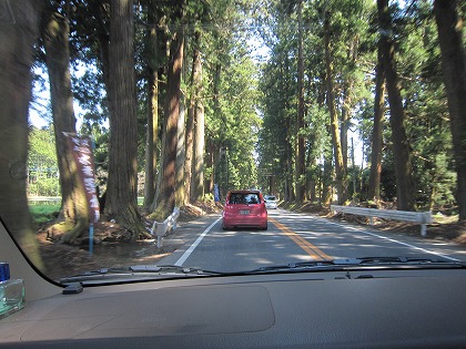 13:37 杉並木で 県道245号線で今市市に出たあとは、国道119号線で宇都宮を目指します。 道の両側に植えられた、日光の杉並木が見事です。 |