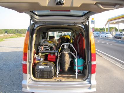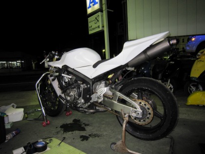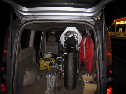 23:44 撤収 とりあえず、リヤ周りの修理は完了。 タンクカバーとリアカウルは装着して、CBRをトランスポーターに積み込み完了。 それでは撤収します。 まだまだ、復活は先になりそう。 追)アイスエイジさん、ふじまきさん、遅くまでありがとうございました。 m(_ _)m |