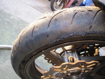 17:27 スリップの跡 CBRをトランスポーターから下ろし、あらためて眺めてみると、前輪に思いっきりスリップした跡が・・・・(^_^;) 普通の走っているところは、写真の右側、タイヤカスが付いているところ。 写真の左側のタイヤカスが付いていないところは、滑って、タイヤカスが取れちゃったところ。 見事にスリップしてます。(笑) |