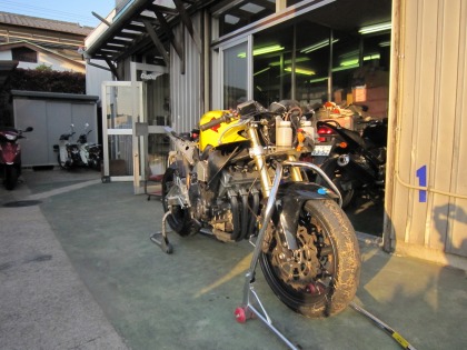 14:30 今日はCBRの修理 先週、YZF−R1の車検が終わって取りに行った時に注文しておいたCBRのシートレールも入荷したと連絡があったのと、バトルファクトリーに出していたサイレンサーの修理が終わって今週、手元に戻ってきてました。 それなので、ゴールデンウィーク中の今日はK2YにCBR600RRの修理に行きます。 まずは、トランスポーターにCBRを積んで自宅を出発します。 CBRで転倒したのは去年の8月8日、それ以降、骨折していて体が不自由だったり、修理の予算がなかったり、仕事が忙しかったりして、放置状態でした。 修理の前に、CBRの洗車をしていたら、出発する時間が少し遅くなってしまいました。 |