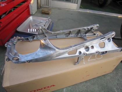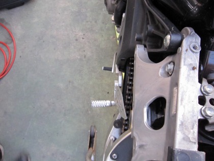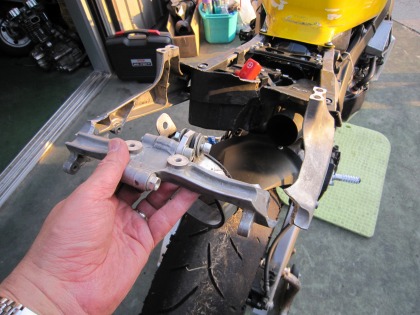 19:01 リヤステー周り リヤステー周りの取り外し完了。 サイレンサーの無いリヤ周りは、なんとなくMotoGPのマシンぽいが、タイヤに付いた芝生が雰囲気を台無しにしている。 |