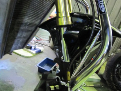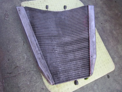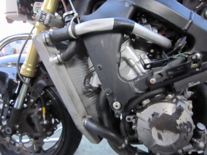 18:27 ラジエータ取付 ラジエータの取付は完了。 水を入れて準備完了。 左側はエンジン2次カバーも取れちゃいましたが、かろうじてジェネレータカバーの破損は逃れました。 でも、また2次カバーを買わなくては・・・・(結構高いんですよね) (>_<) |